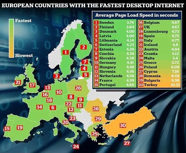 بااین حال، حتی با سرعت پایین‌تر نسبت به دسکتاپ، سوئد همچنان سریعترین سرعت تلفن همراه را در اروپا دارد و یک صفحه در ۷.۴۸ ثانیه بارگذاری می‌شود.در رتبه دوم دانمارک با میانگین ۷.۶۵ ثانیه قرار دارد و پس از آن فنلاند و لتونی به ترتیب با ۷.۸ و ۷.۹۳ ثانیه هستند.